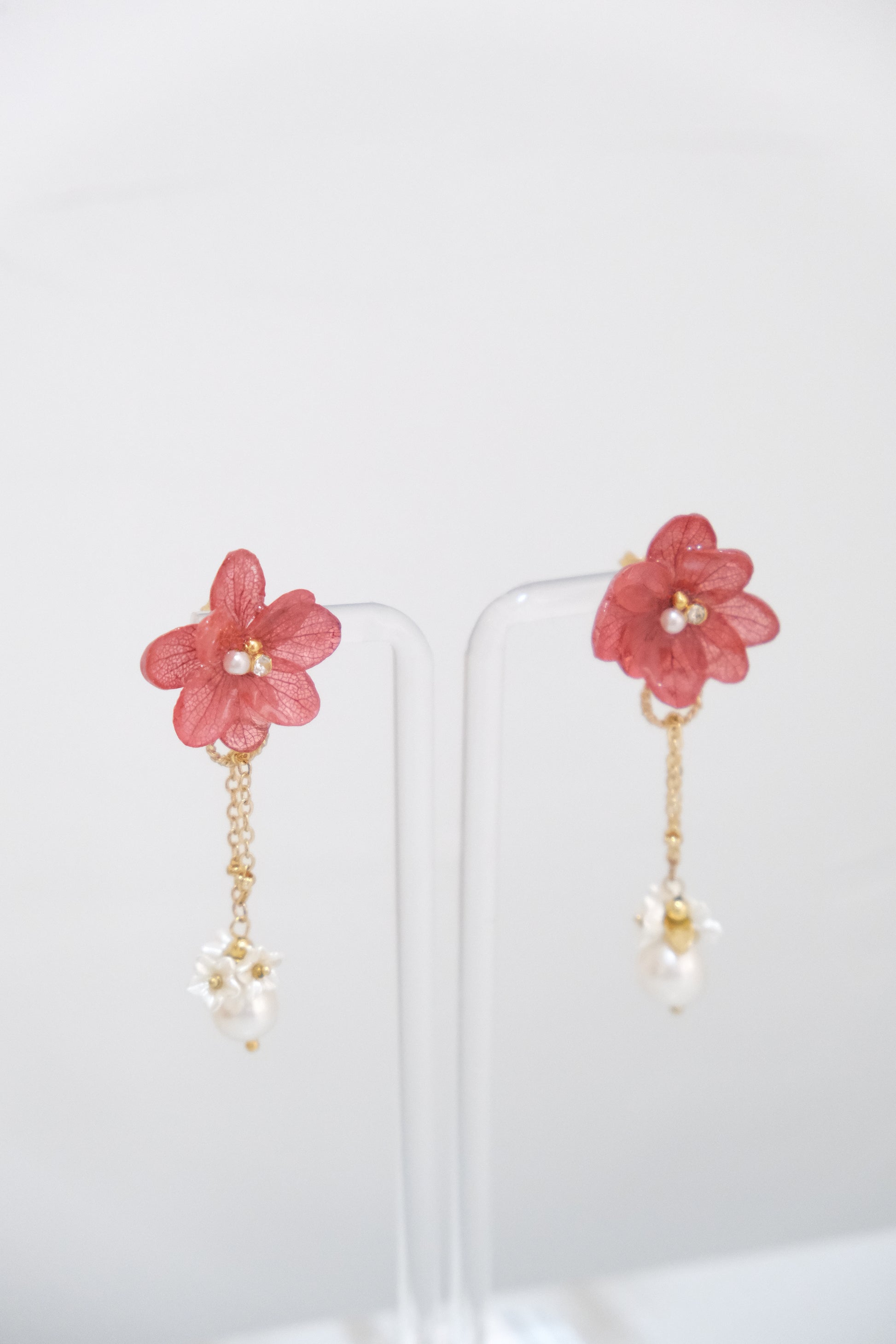 The earring is paired with preserved hydrangea and freshwater pearls.